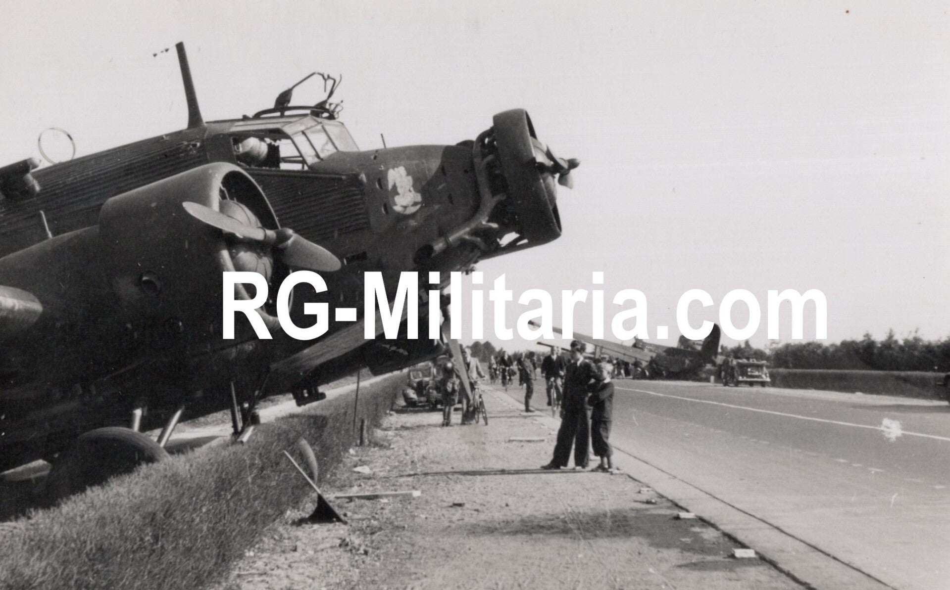 Originele Wo2 Duitse Foto - Rijksweg bij Delft met gelande Junkers JU 52-vliegtuig met decal, Blitzkrieg mei, Nederland (1940)