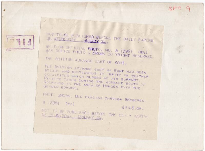 Original WW2 British Press Photo - British soldiers in white camouflage passing through Breberen, Germany (1945)