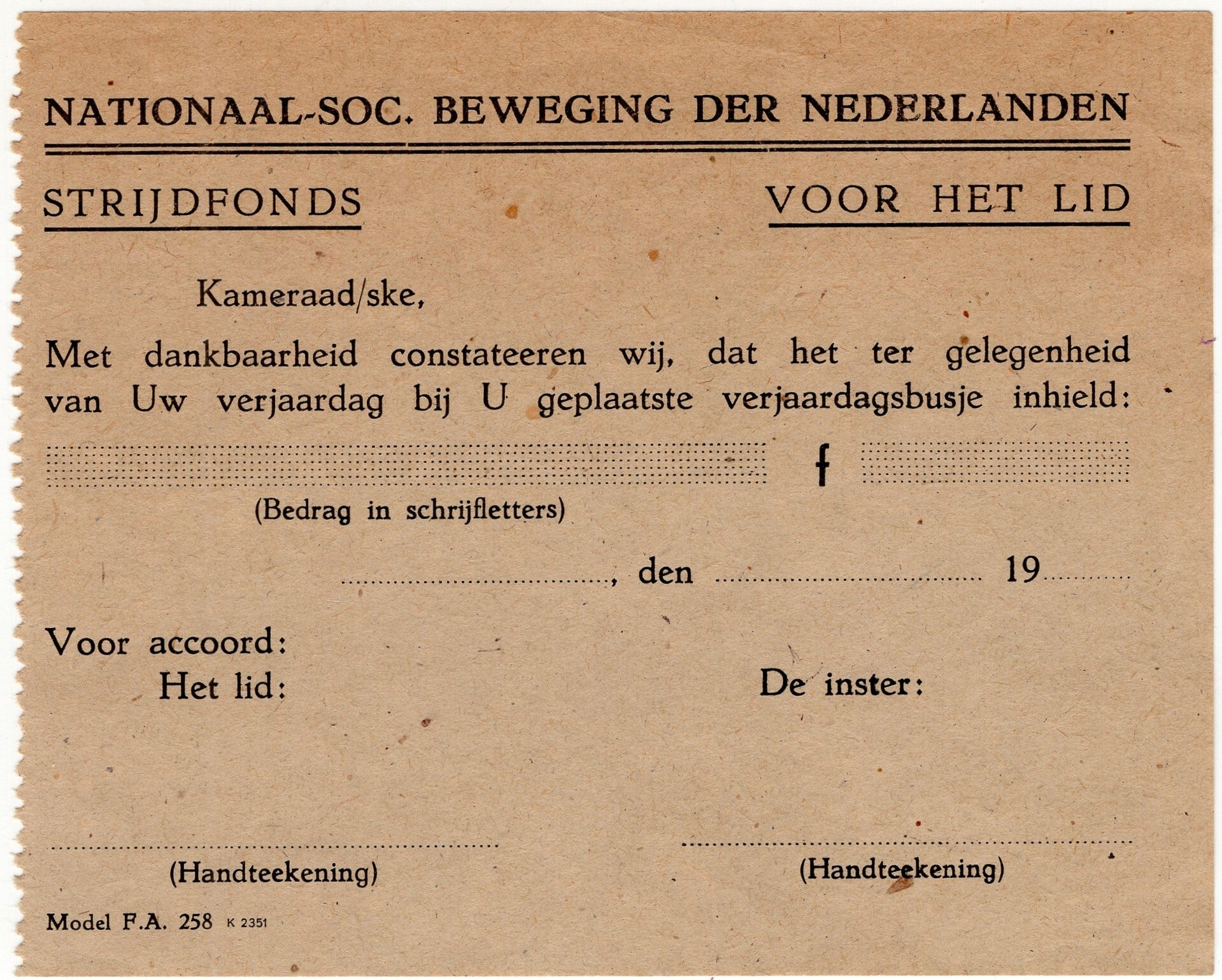 Blank document from the NSB Strijdfonds regarding a birthday present