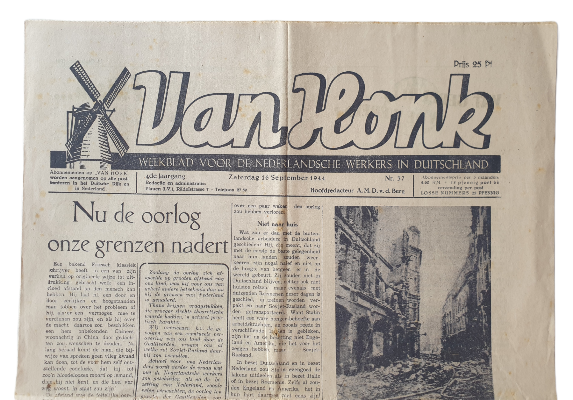 Dutch newspaper - Van Honk ''Weekly for the Dutch workers in Germany'' Nr. 37. Issue from the 16th of September 1944.
