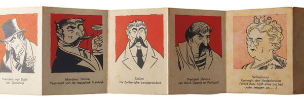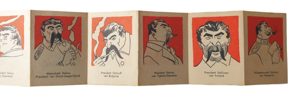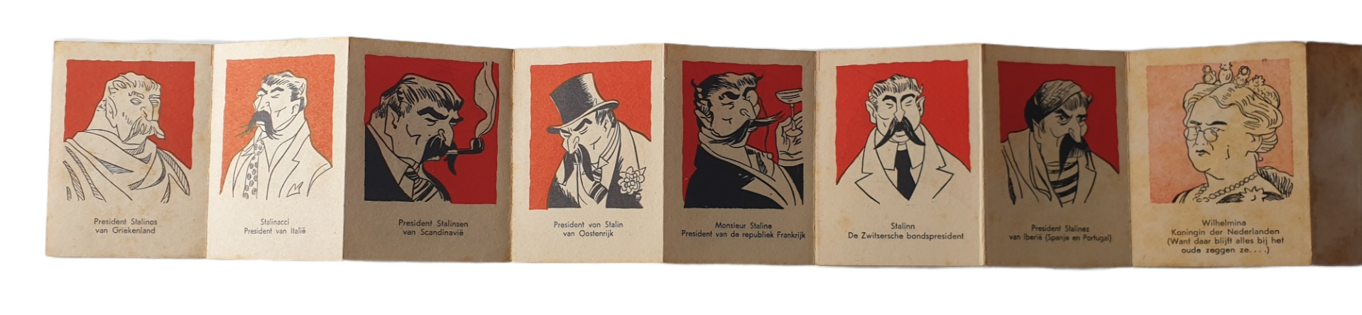 NSB flyer - 16 staatshoofden van het Europa der Toekomst. This flyer illustrates the future leaders of countries in Europe. All of the leaders are Stalin, warning people that Stalin will take over Europe.