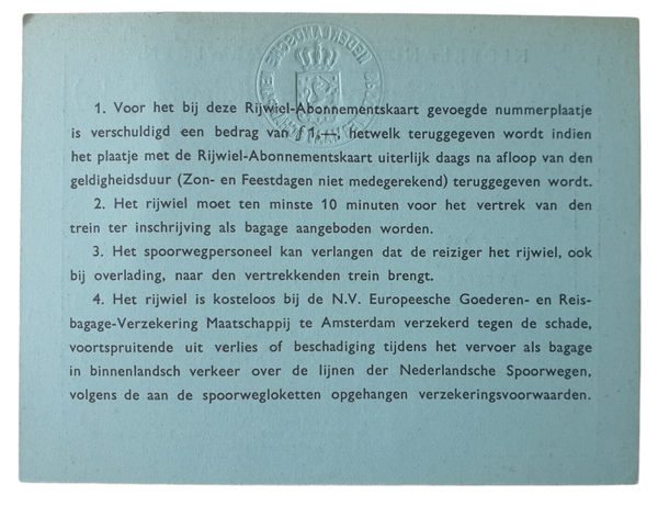 Unused NS Nederlandsche Spoorwegen (Dutch railroads) bicycle subscription from 1943.