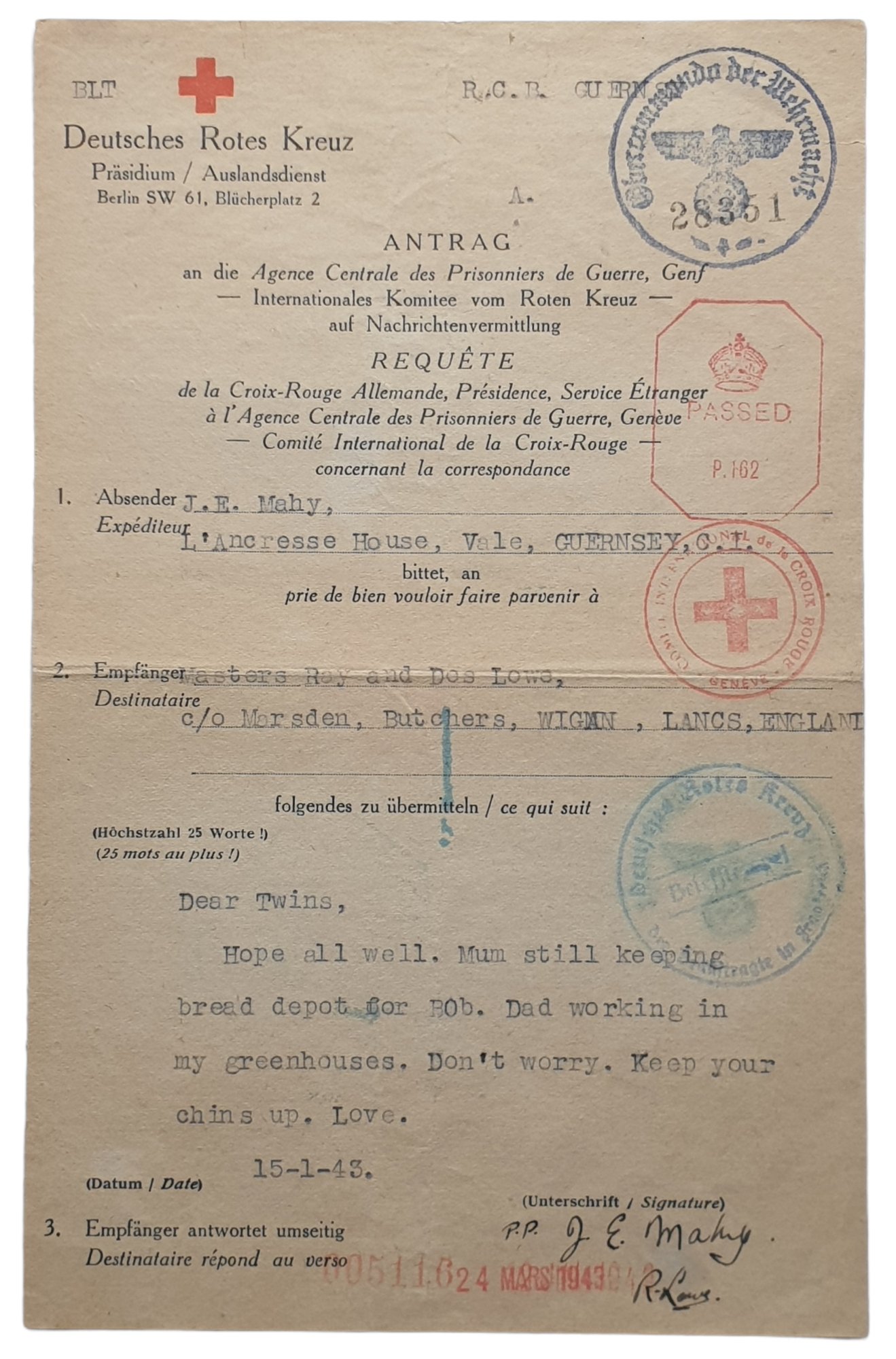 Original WW2 German Document - Red Cross letter from Guernsey (1943)