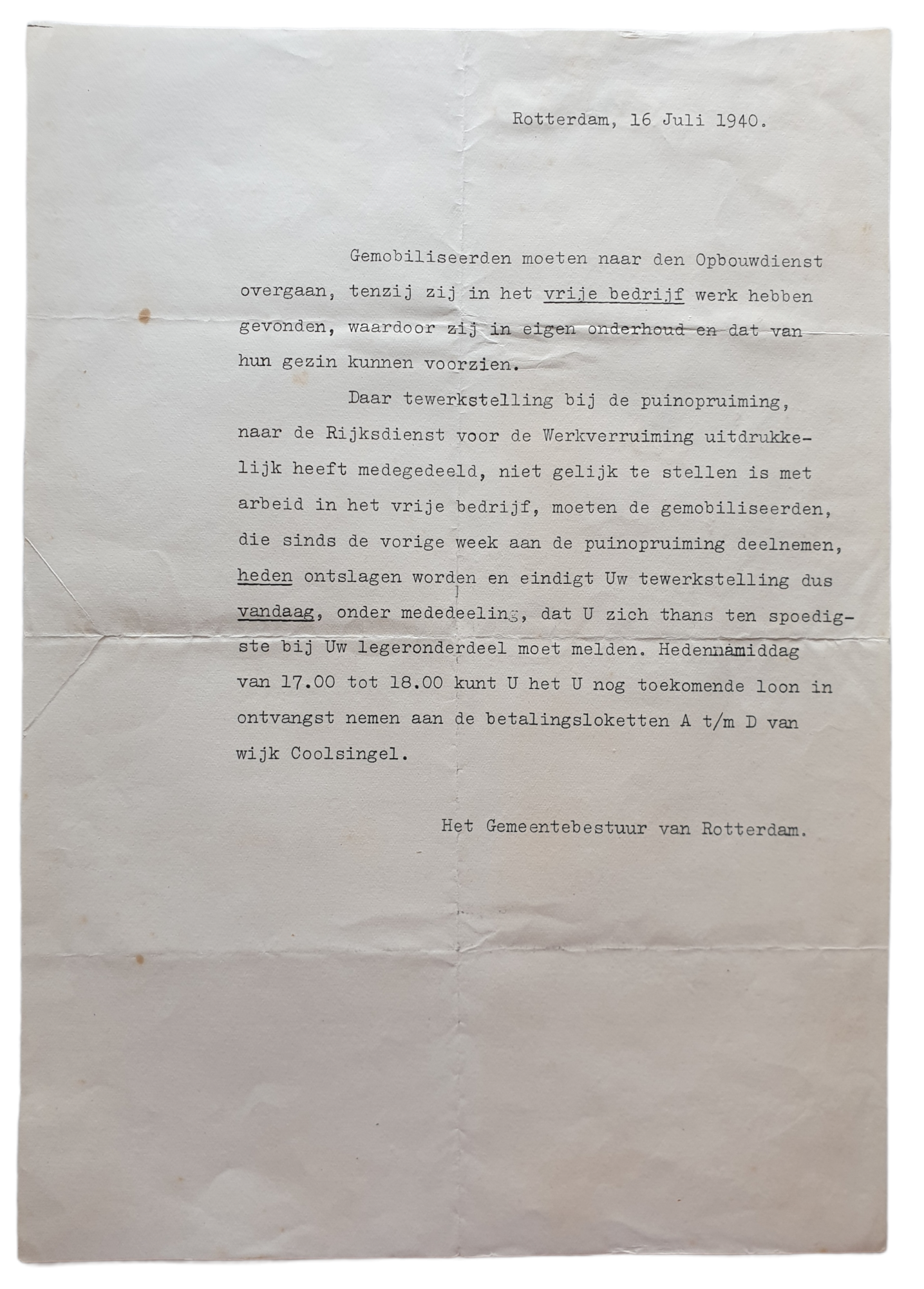 Opbouwdienst - letter Rotterdam 16th of July 1940 about helping clearing up debris after the bombardment of Rotterdam.