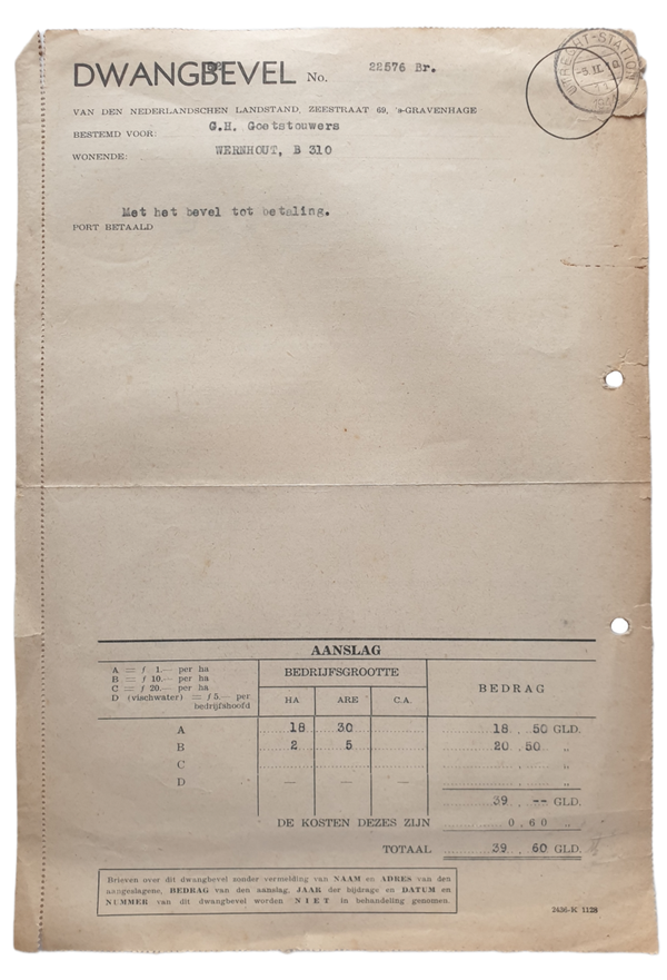 Nederlandsche Landstand Dwangbevel voor een inwoner in Wernhout.