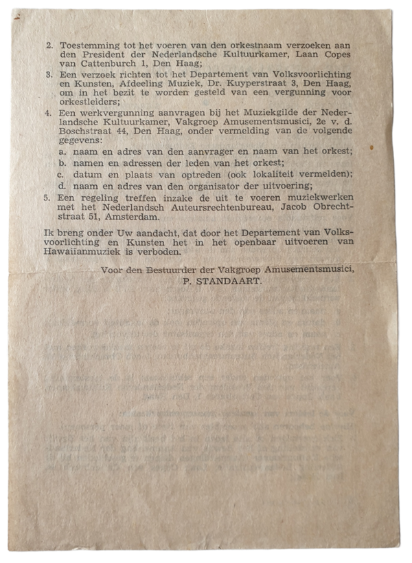 The Nederlandsche Kultuurkamer was an organisation that every artist needed to be a member of, if you weren't you were forbidden by law to perform, The press and writers also needed to join that organisation. This document is for the music guild.