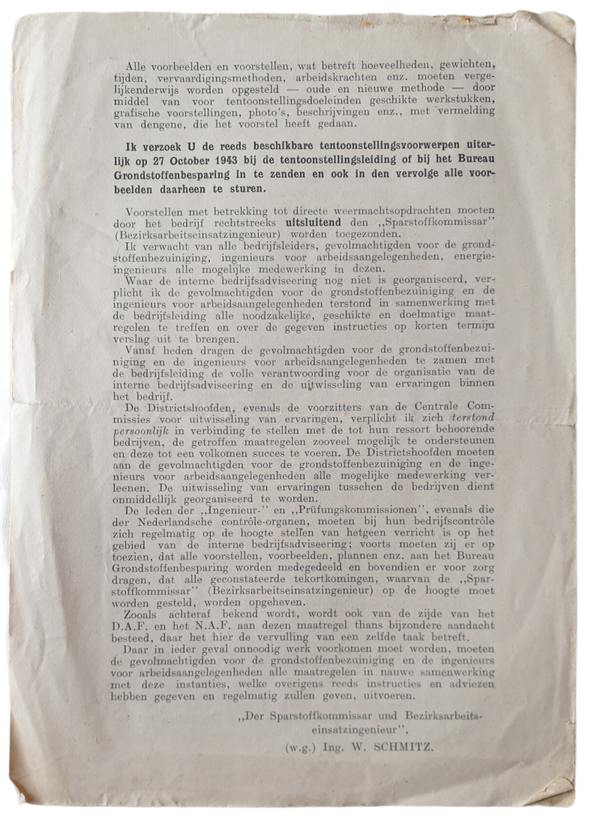 Document - ''Der Sparstoffkommissar und Bezirkarbeitseinsatzingenieur'' betreffende een Mededeeling aan alle Gevolmachtigden voor de Grondstoffenbezuinigign en de ingenieurs voor arbeidsaangelegenheden.