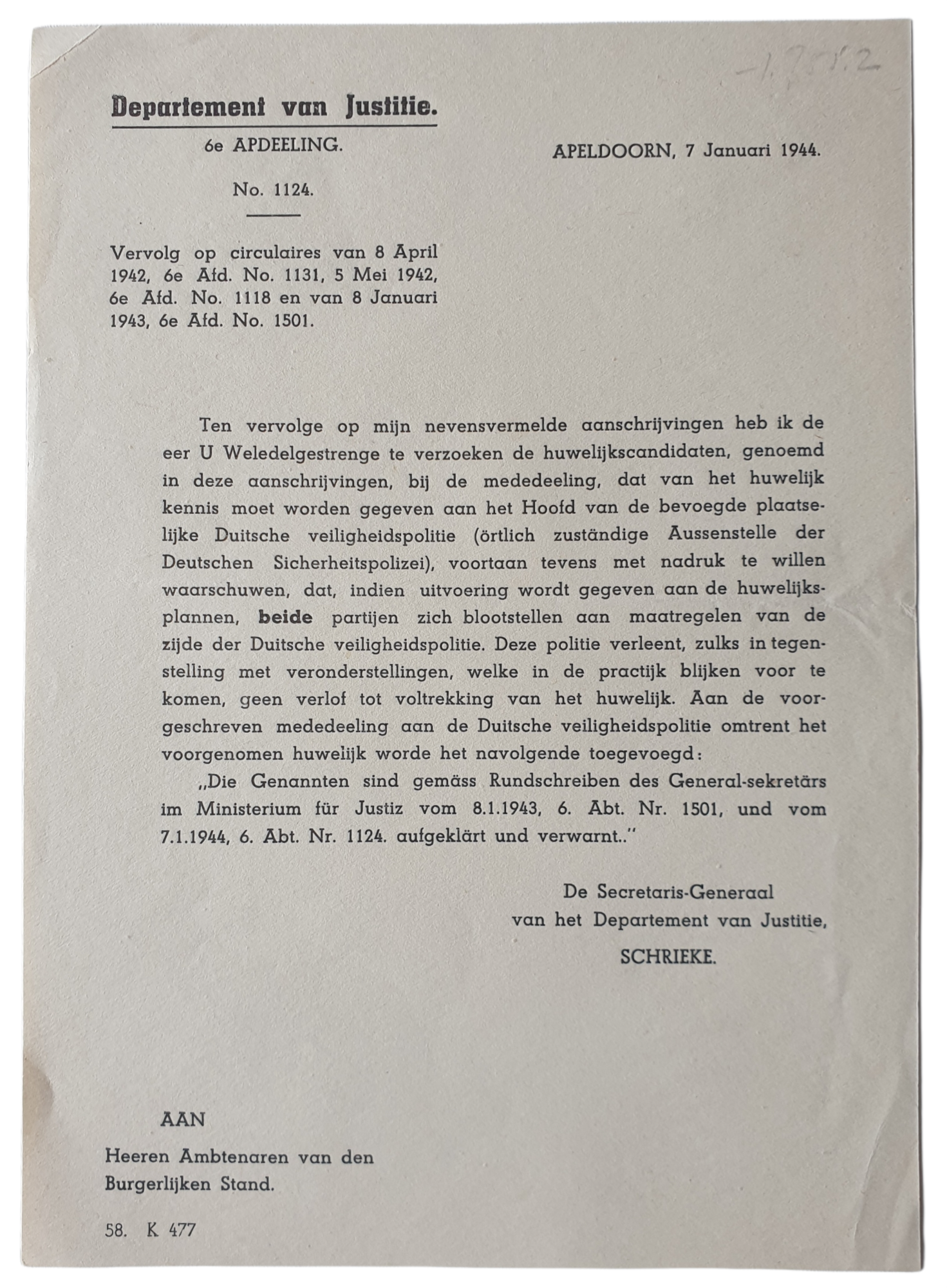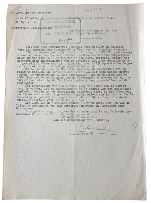 Document - De ouders van Duits geboren baby's in Nederland moeten verplicht trouwen. Deze documenten zijn verzonden naar de gemeente Krimpen aan den Ijssel.