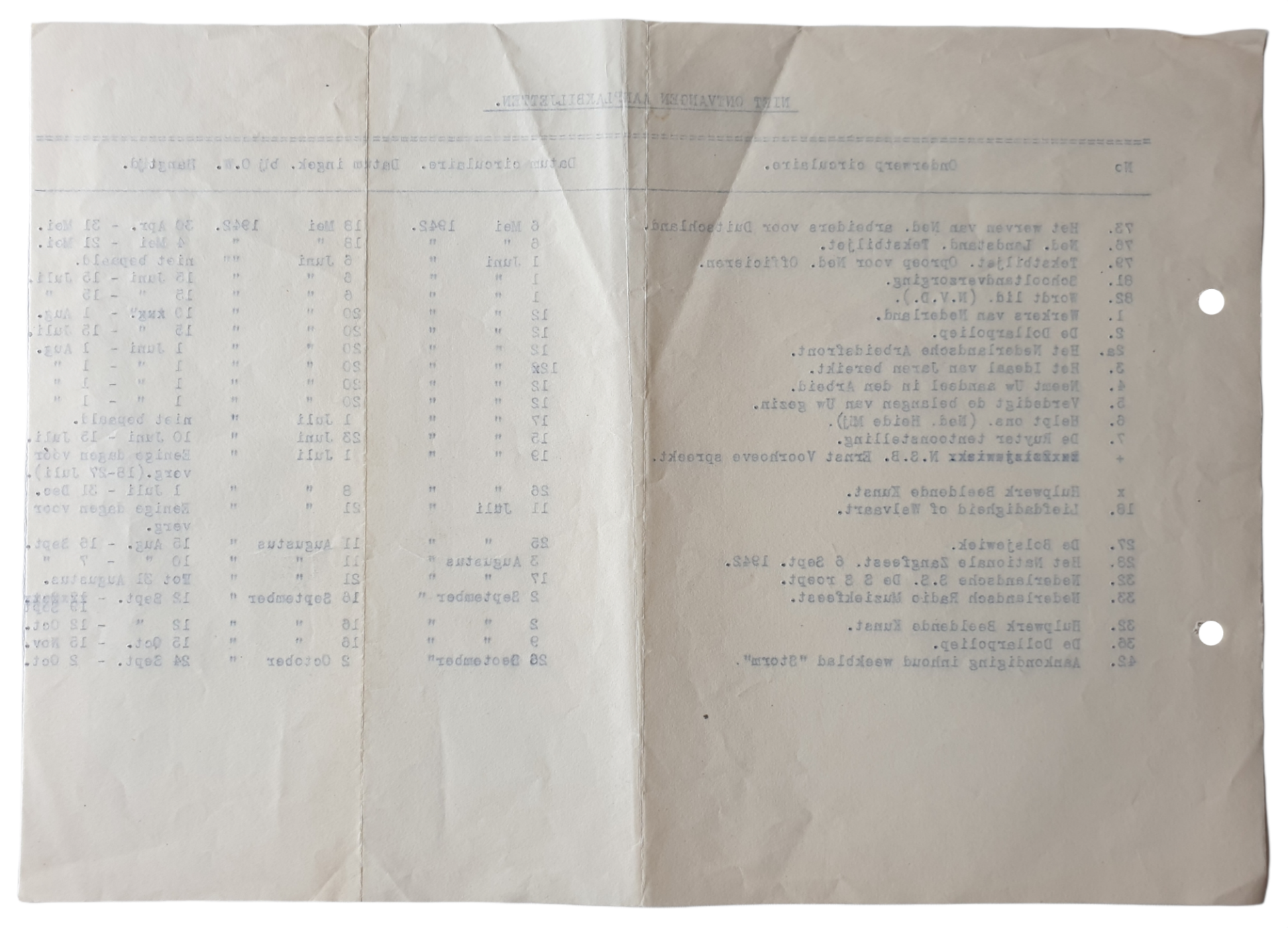 Document - List of not received posters, including the posters ''Het Nederlandsche Abriedsfront''. ''De Dollarpoliep'', ''NSB Ernst Voorhoeve Spreekt''. ''De Bolsjewiek'', ''Nederlandsche SS de SS roept'' and ''Aankondiging inhoud weekblad ''Storm'''''.
