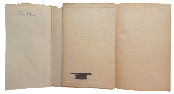 Stofomslag beschadigd, met doorgestreepte ex libris van een eerdere eigenaar.