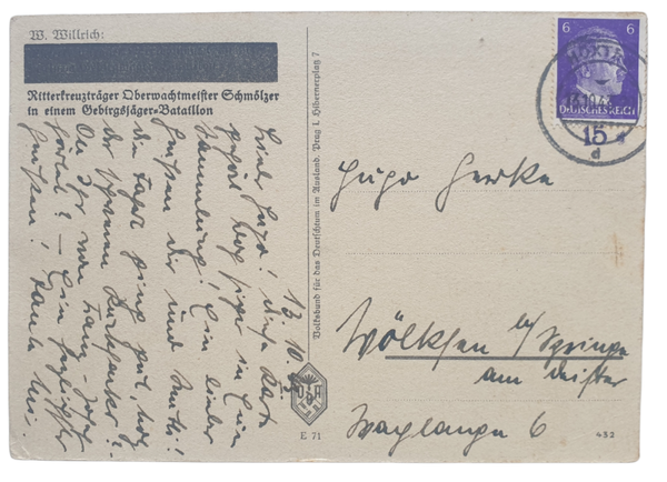 Postkaart van de Gebirgsjager Ritterkreuzträger Oberwachtmeister Johann Schmölzer door W. Willrich
