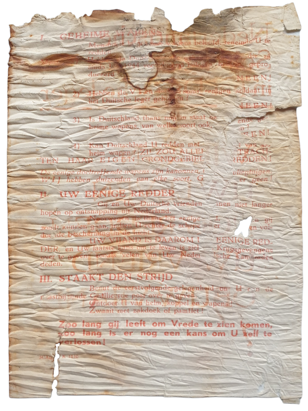 Pamflet ''Nederlandse soldaten in het Duitse leger!''. Dit pamflet was bestemd voor de Nederlandse vrijwilliger bij de SS, afgeschoten in een granaat in de buurt van de Betuwe.