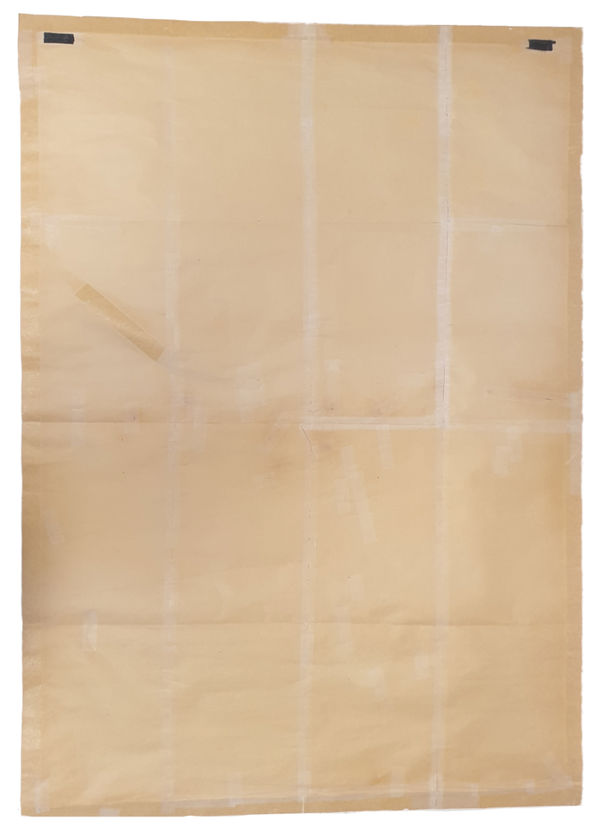 Beschadigd, gescheurd en gerepareerd met zuurvrij plakband. Er zit ook een ander soort tape om de rand, dit is 50 jaar geleden gedaan om de randen te versterken. De poster is zeer fragiel, het is aan te raden om de poster gelijk in te lijsten.