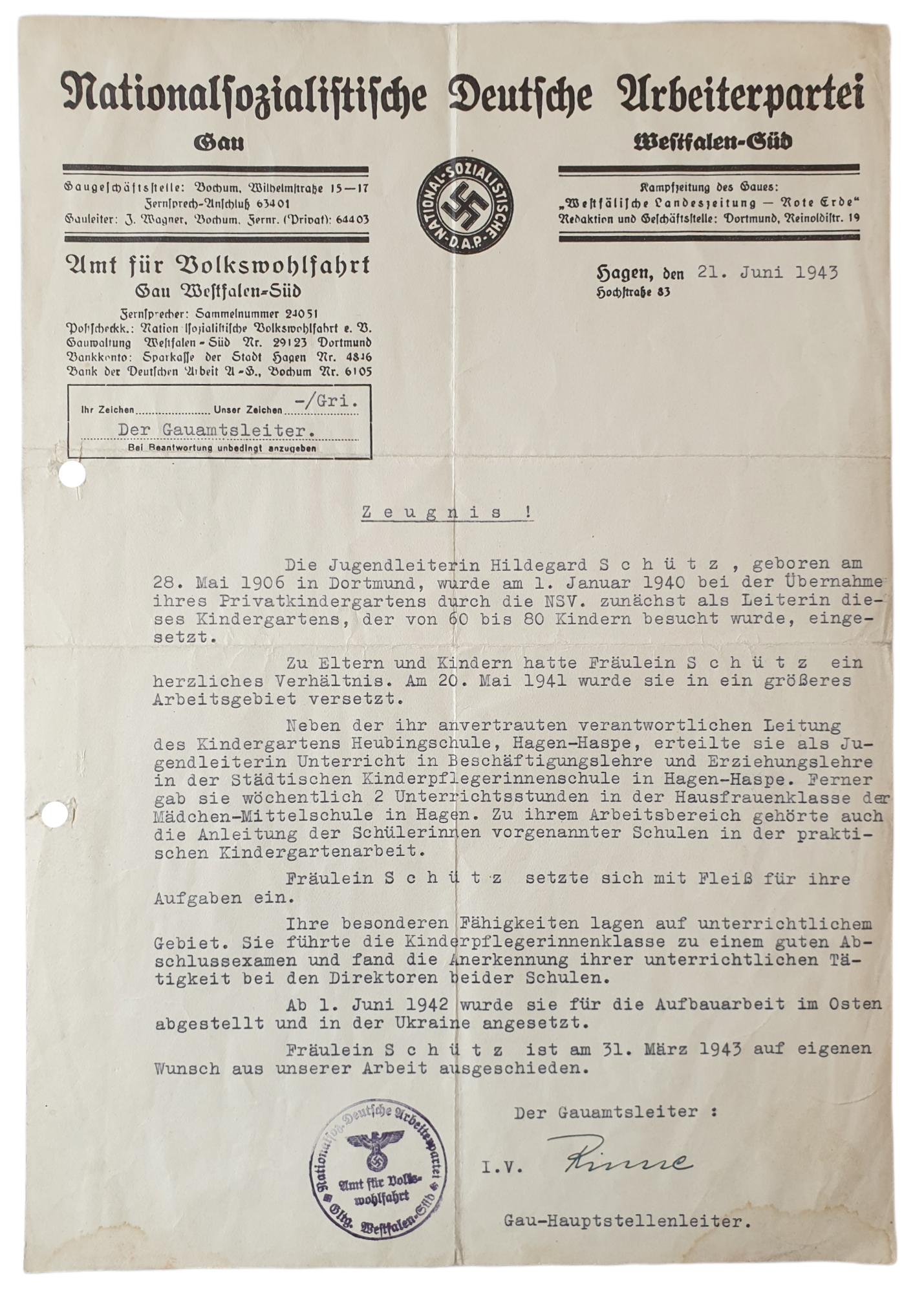 Document - NSDAP letter Gau Westfalen-Süd, NSV Ukraine (1943)
