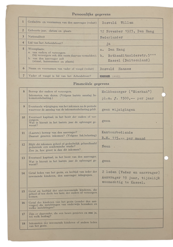 NAF document - Nederlandsche Arbeitsfront Staat van Inlichtingen (1943/1944)