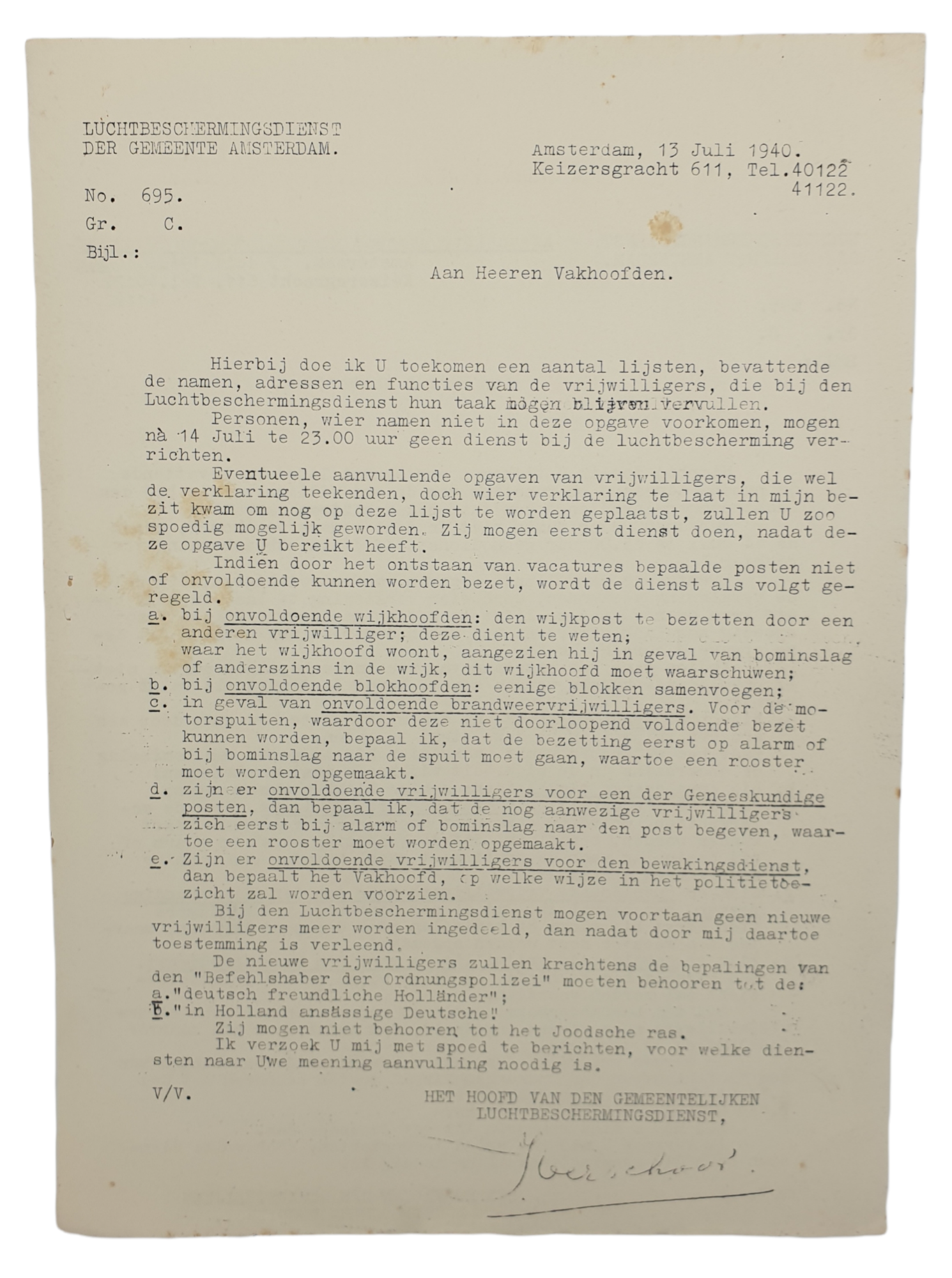 LBD document - Luchtbeschermingsdienst Amsterdam notice for blokhoofden (1940)