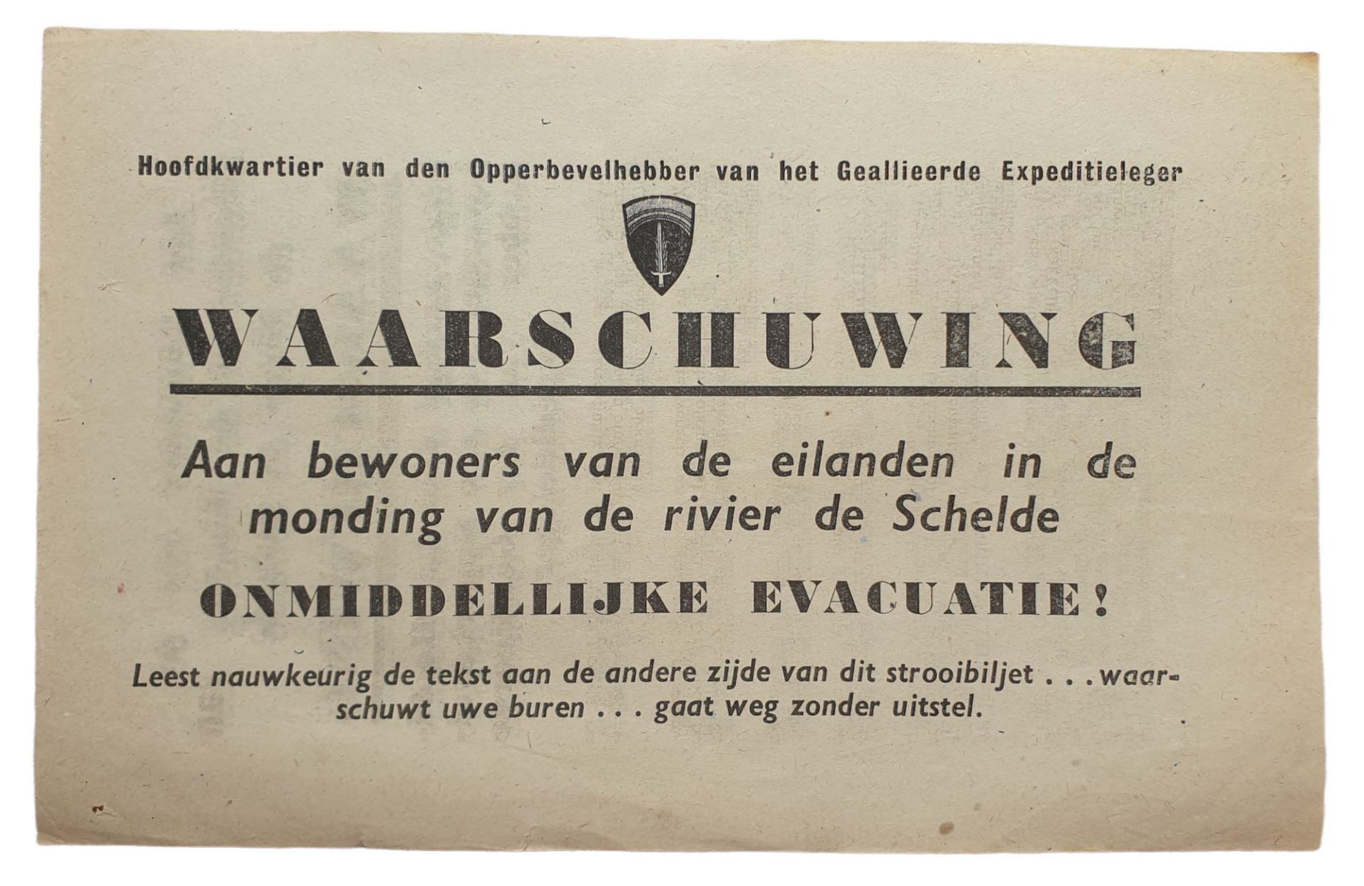British leaflet for Dutch civilians with leaflet code ZH 3. This leaflet was dropped in the Scheldt to warn the civilians to leave the Scheldt immediately.