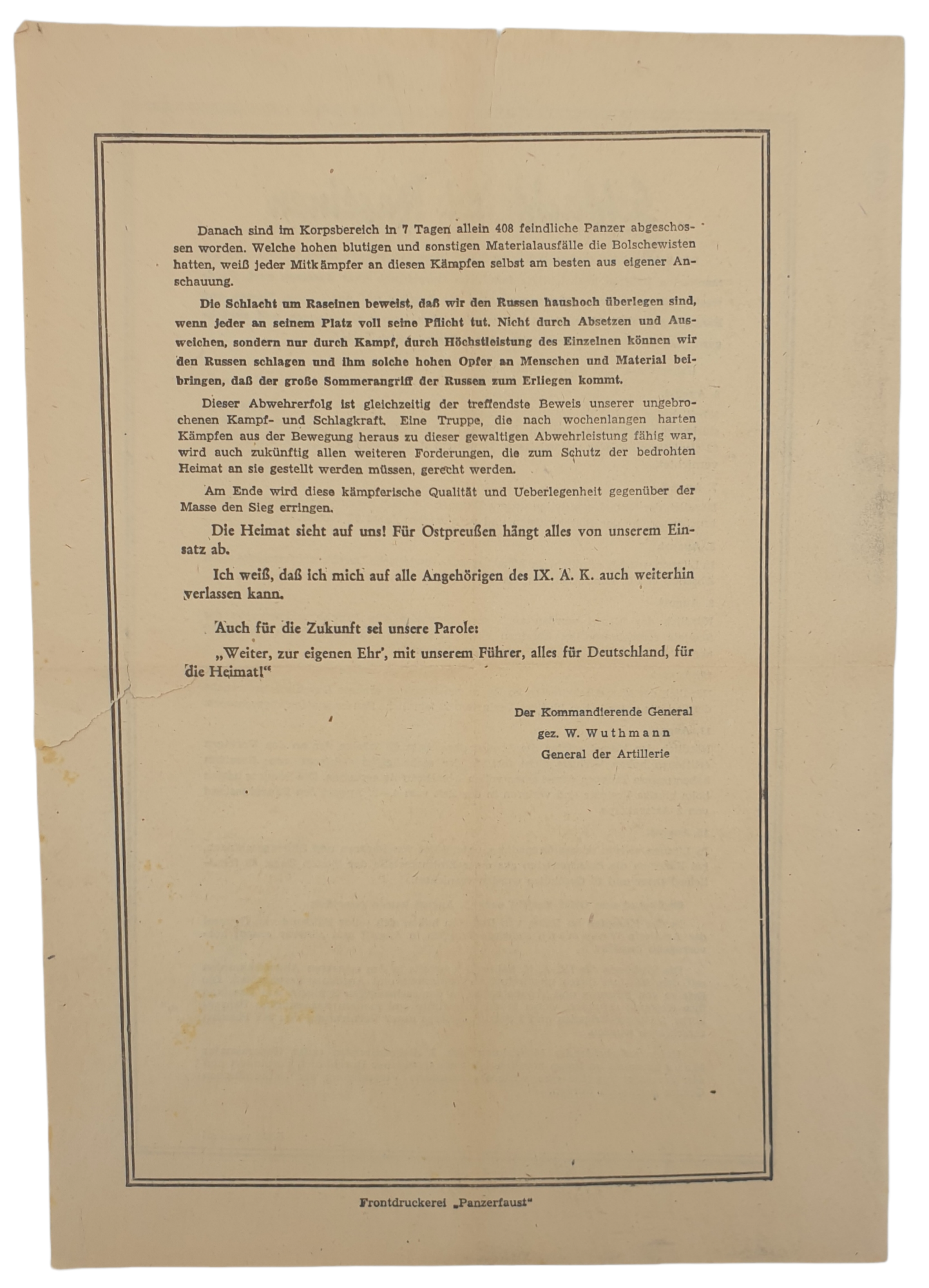 Original WW2 German Document - Schlacht Bei Raseinen, General der Artillerie Wuthmann