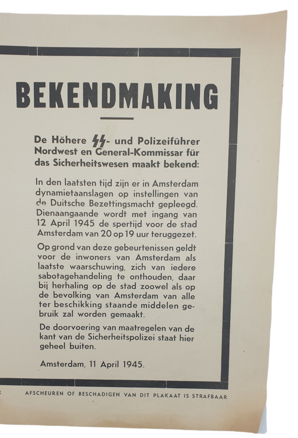 Original WW2 Dutch Poster - SS Announcement poster curfew, Amsterdam, 14th of April (1945)