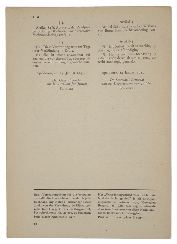 Origineel Wo2 Nederlands Document - Verordnungsblatt fur die besetzten Niederlandischen Gebiete No. 1 (1945)