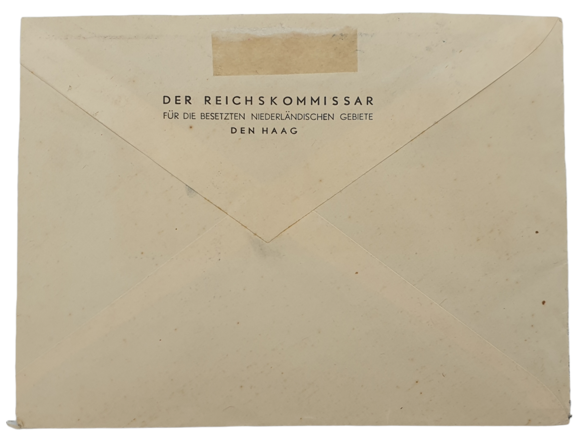 Empty envelope ''Der Reichskommissar für die besetzten Niederländischen Gebiete Den Haag'' stamped with ''Der Reichskommissar für die besetzten Niederländischen Gebiete Zentrale Ein- u. Ausreisestelle Der Höhere SS- und Polizeiführer 1 Briefstempel''