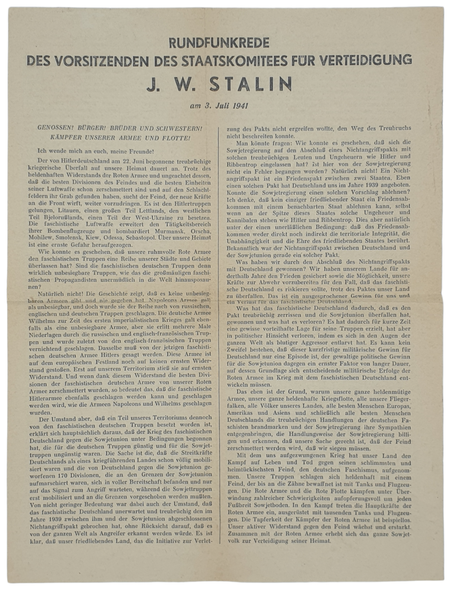 Original WW2 Russian Leaflet - Runkfunkrede des vorsitzenden der Staatskomitees für verteidigung, J. W. Stalin, 3rd of July (1941)