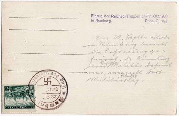 Original WW2 German Postcard - Einzug der Reichsd. Truppen am 2 okt in Rumberg (1938)