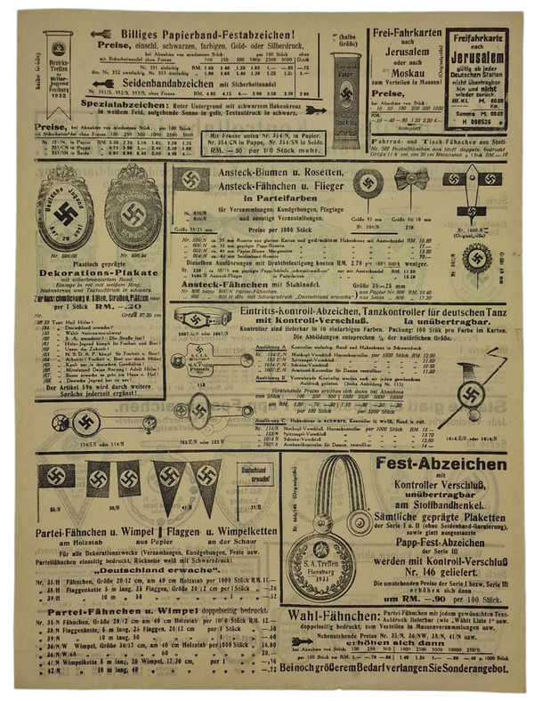 An interesting sale list of a German company for propaganda decorations. Includes an antisemitic ''train card'' for Jewish people.