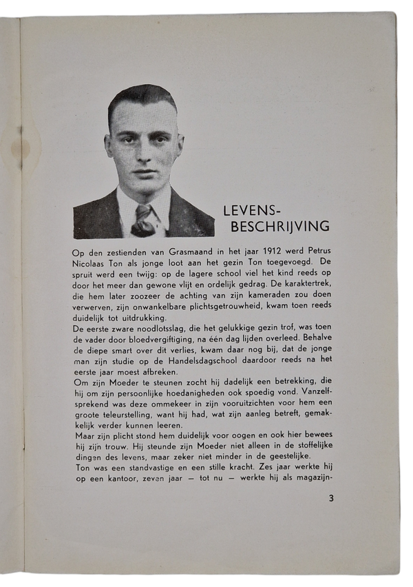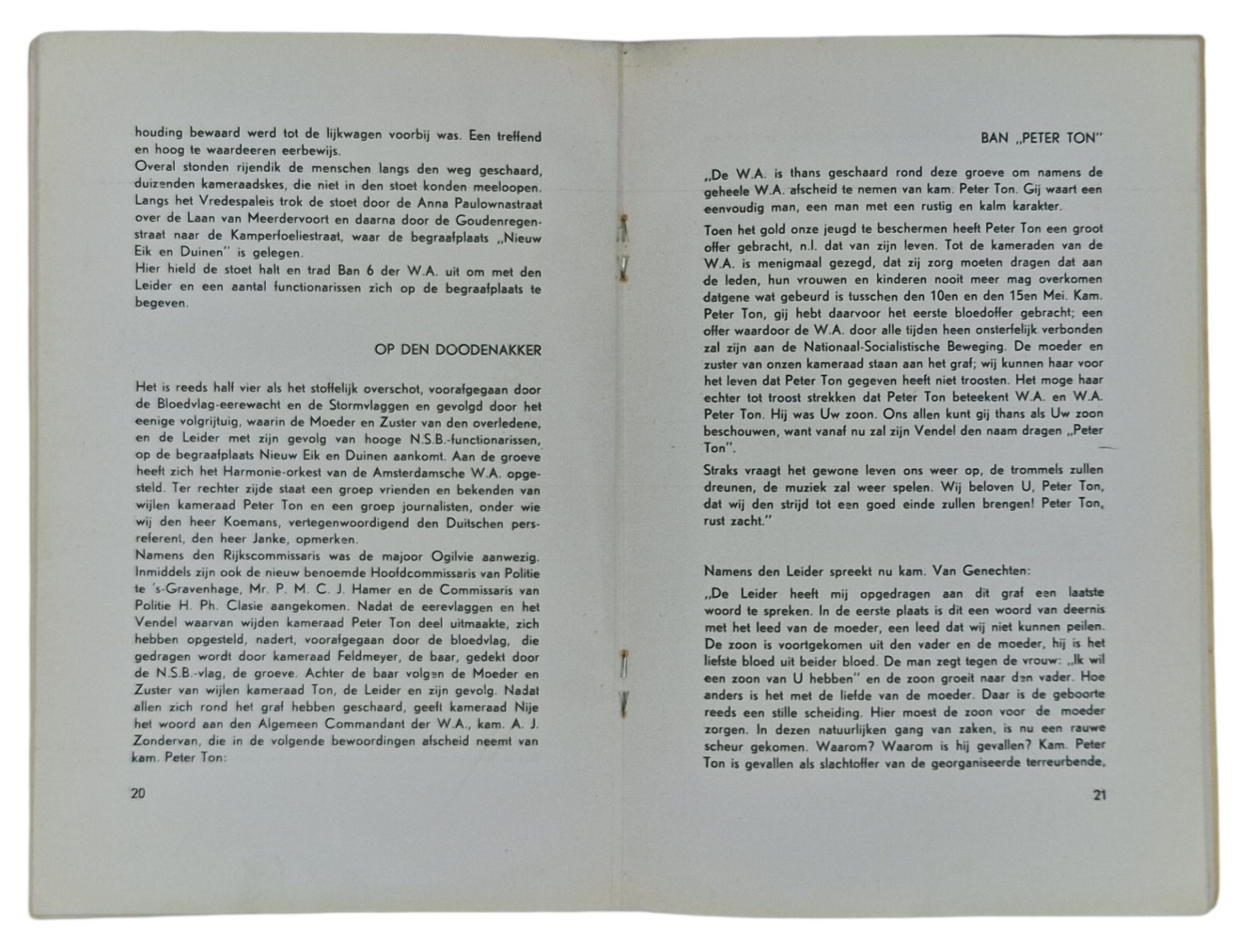 In 1940 the WA man Peter Ton got killed during a parade in The Hague. The NSB held a large funeral for him and this brochure remembers him.