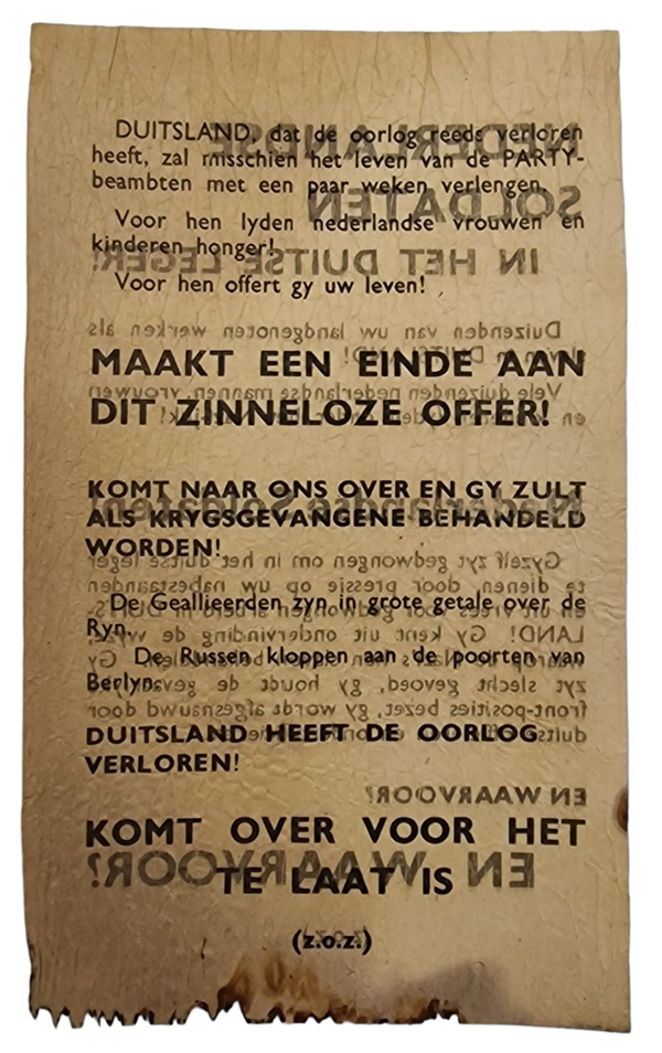 Brits pamflet ''Nederlandse soldaten in het Duitse leger!''. Dit pamflet was bestemd voor de Nederlandse vrijwilliger bij de SS, afgeschoten in een granaat in de buurt van de Betuwe.