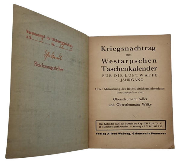 Original WW2 German Book - Kriegs Nachtrag zum Westarpschen Tschenkalender für die Luftwaffe (1940/41)