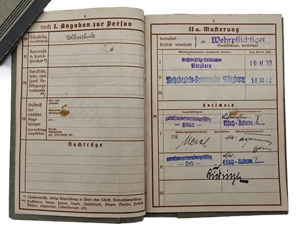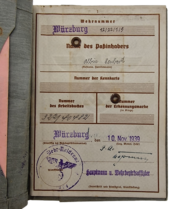 Original WW2 German ID Card - Wehrpass Wehrpflichtiger Würzburg (1939)