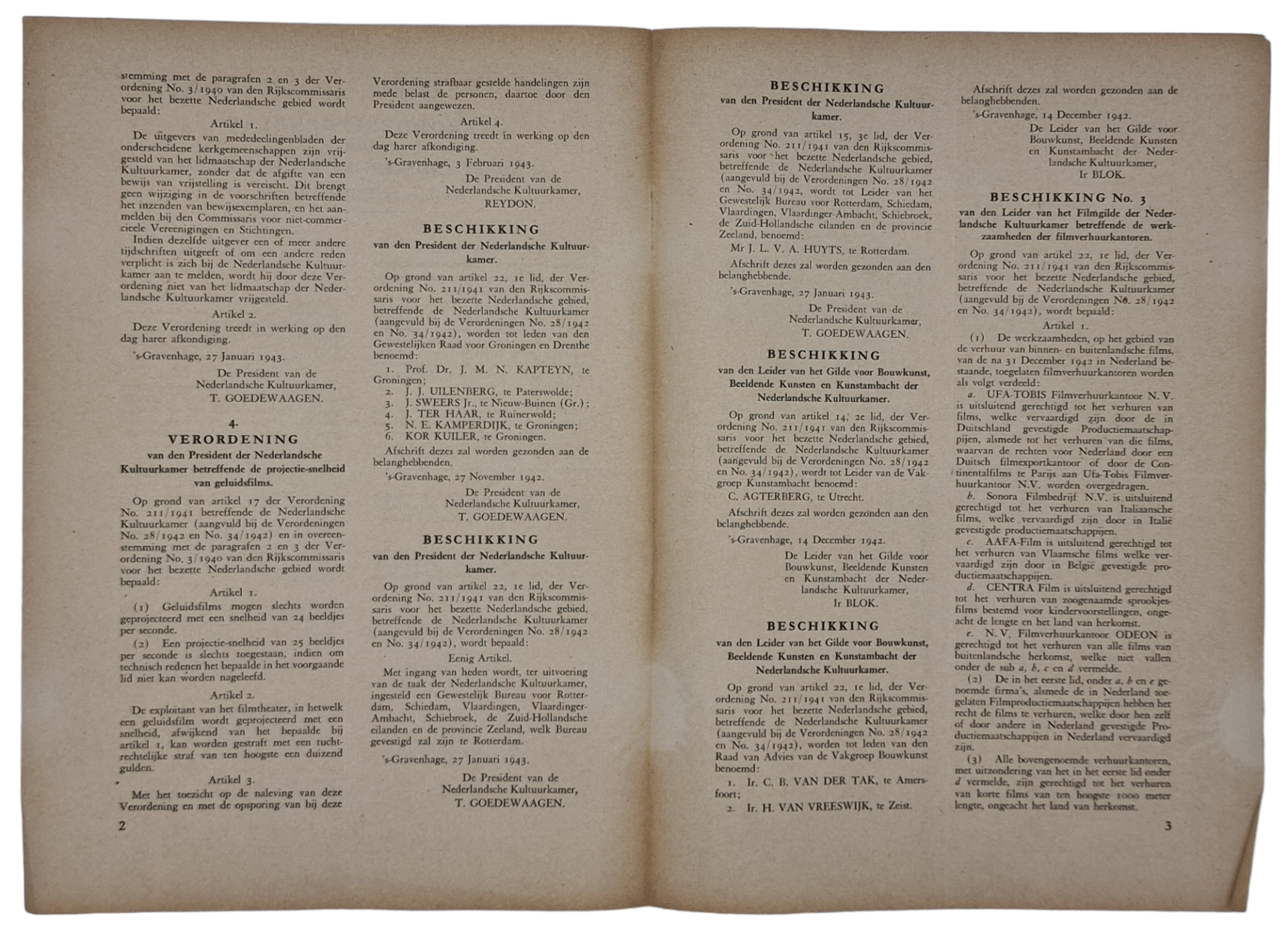 Original WW2 Dutch Collaboration Document - Verordeningenblad Nederlandsche Kultuurkamer No. 1 (1943)