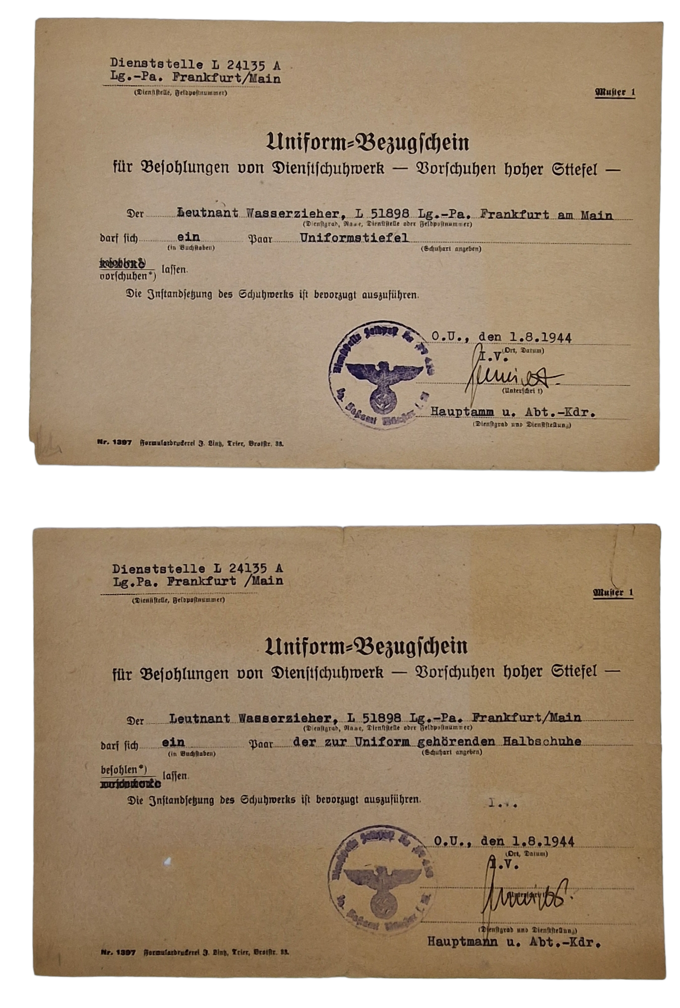 Original WW2 German Document - Uniform Bezugschein, Frankfurt (1944)