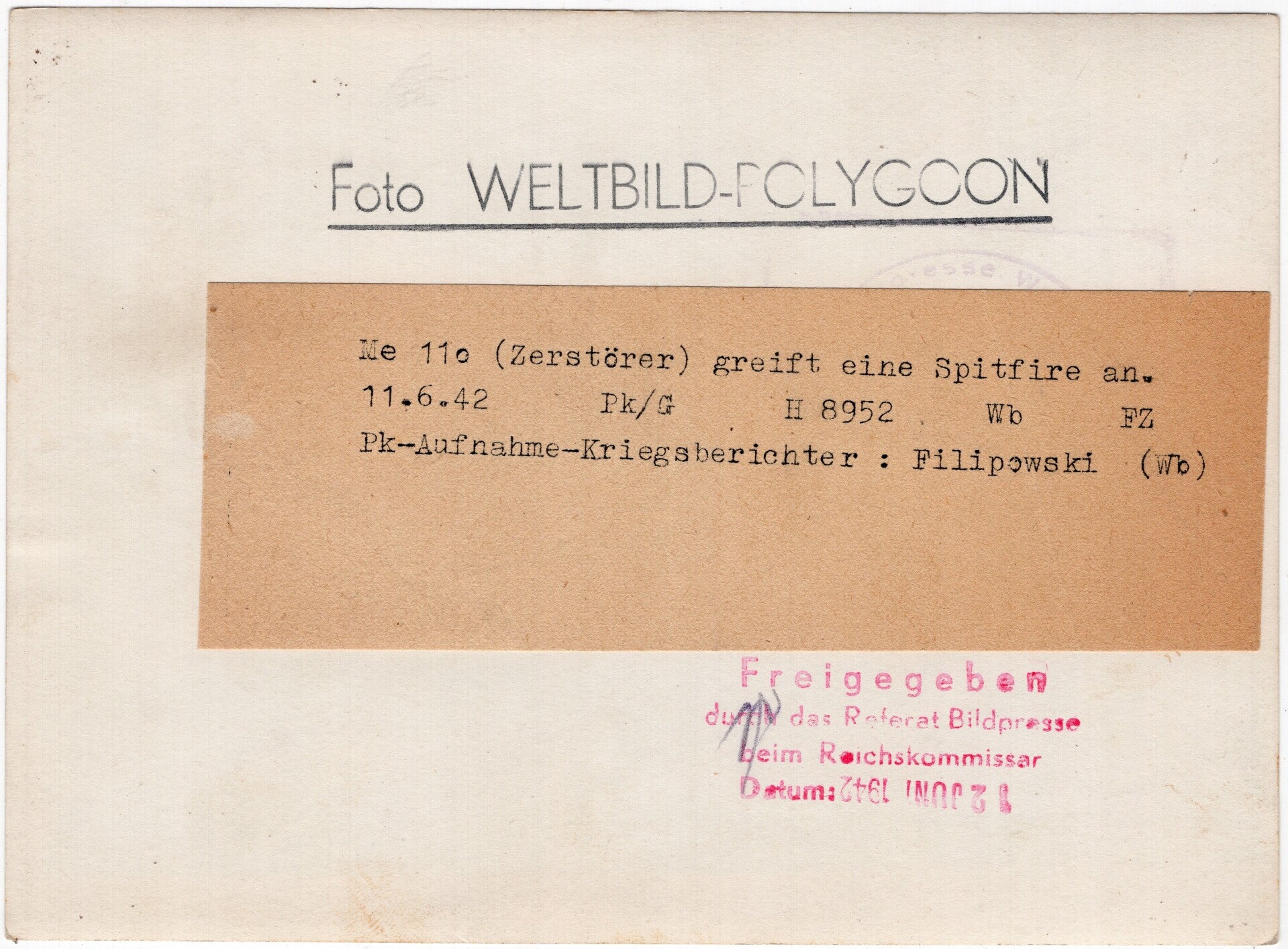 Originele Wo2 Duitse Persfoto - Schilderij Me 110 vechtend met een Spitfire (1942)