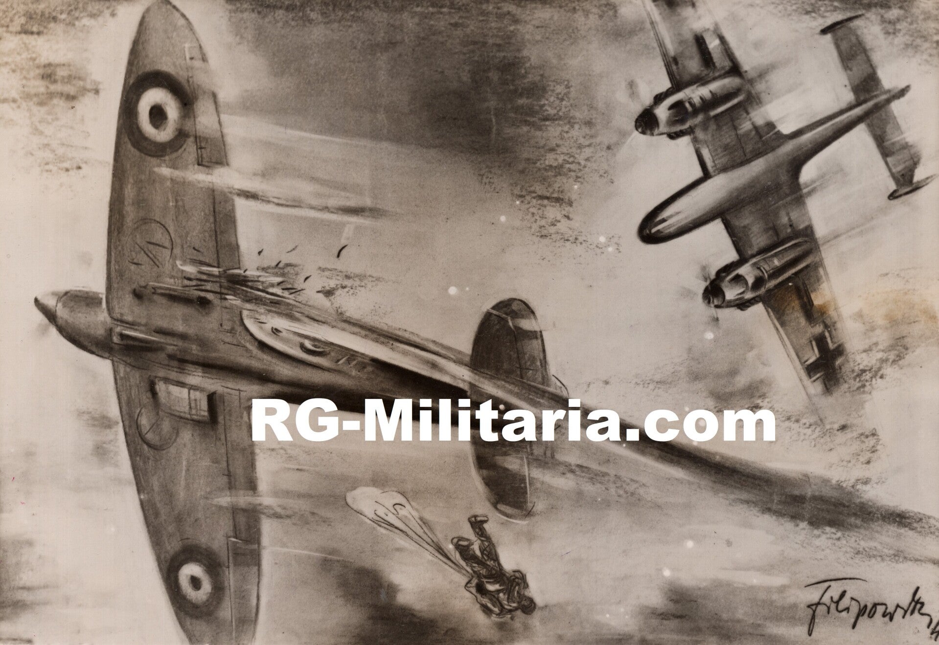 Original WW2 German Press Photo - Painting Me 110 fighting with a Spitfire (1942)