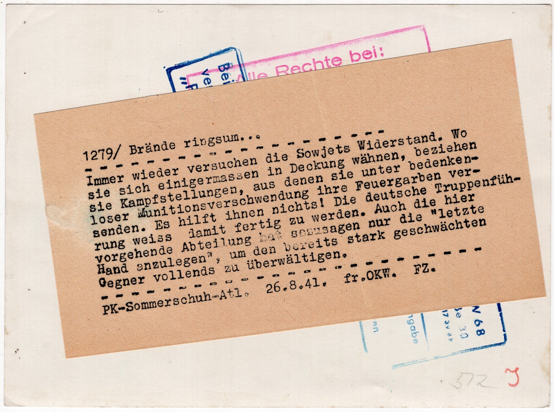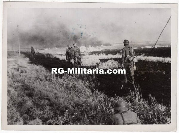 Original WW2 German Press Photo - German soldiers in a burning field, Eastern Front (1941)