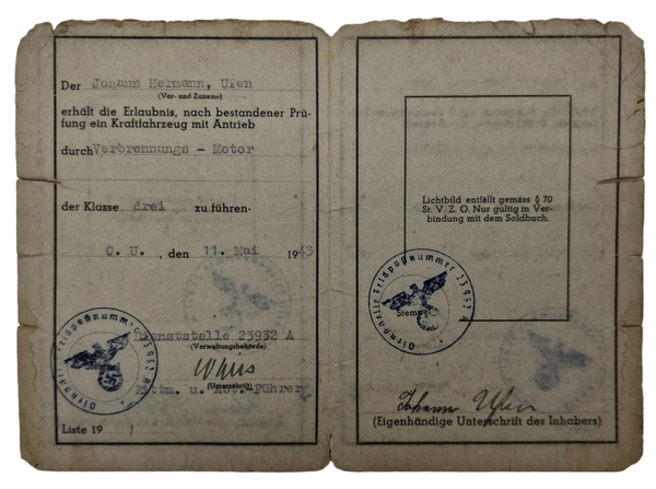 Original WW2 German Document - Wehrmacht Führerschein with photo (1943)