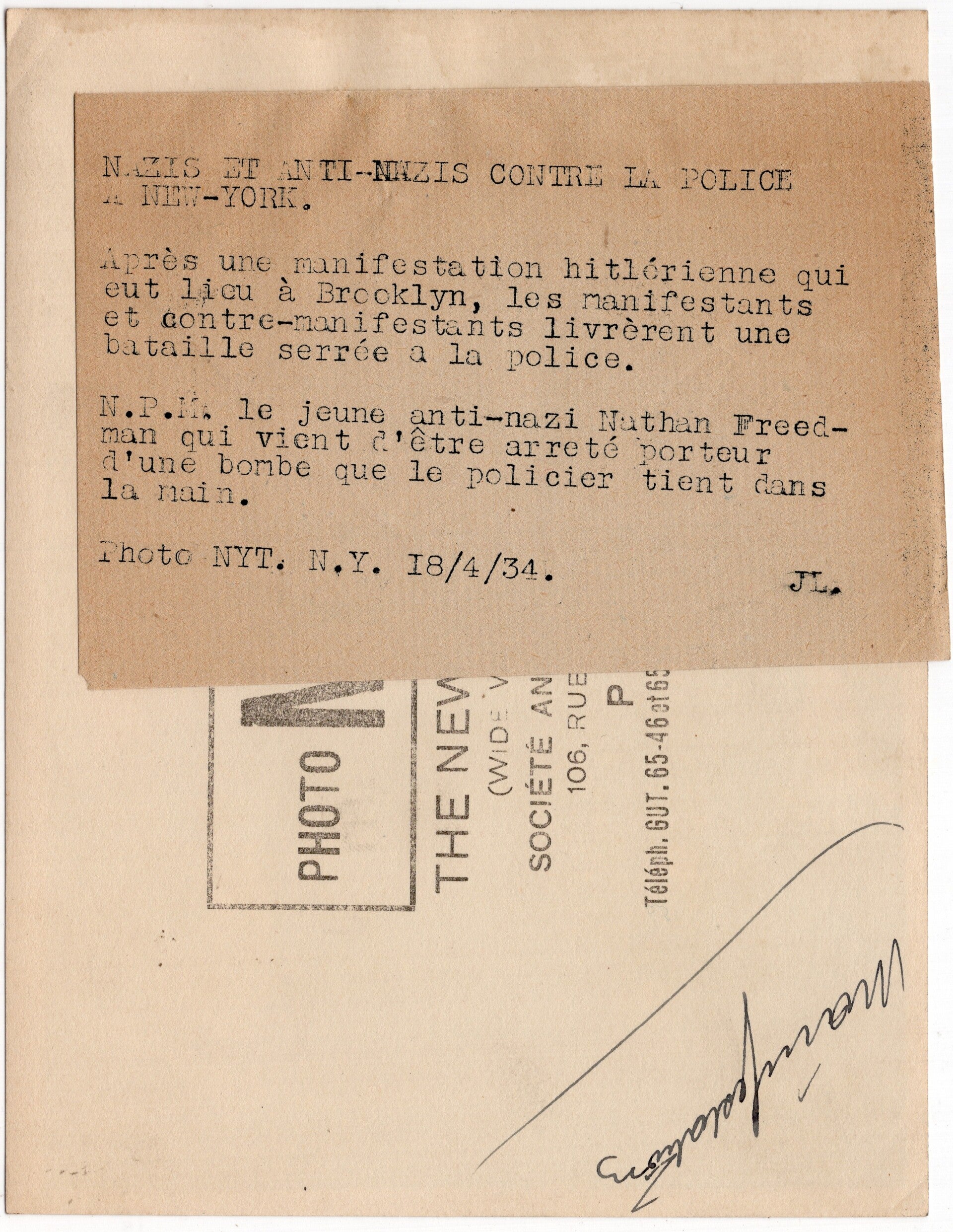 Original WW2 French Press Photo - Anti-nazi Nathan Freedman arrested with a bomb on a nazi rally in New York, USA (1934)