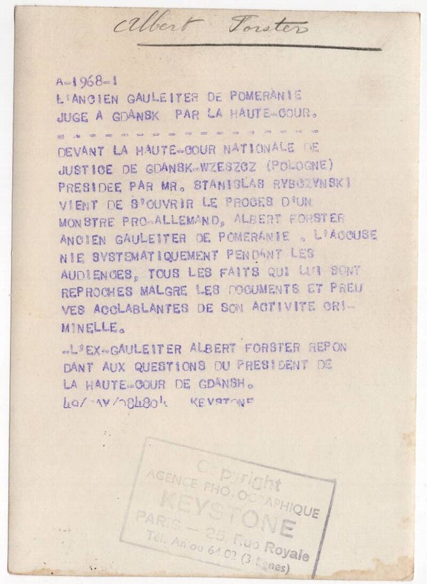 Original WW2 French Press Photo - Gauleiter Danzig, Albert Forster on trial (1948)