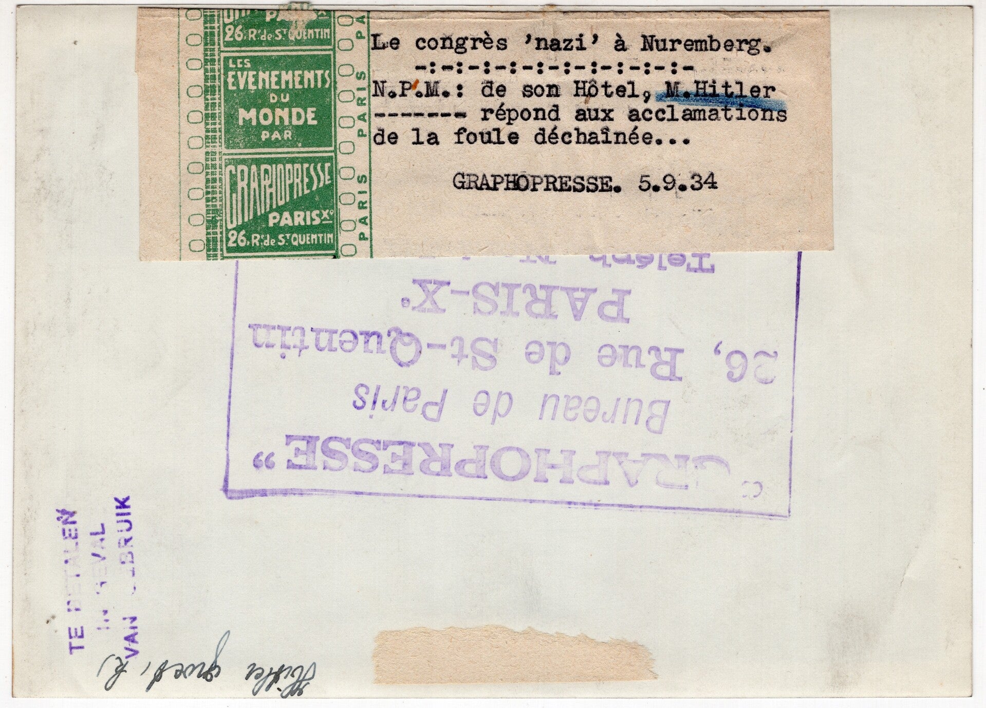 Originele Wo2 German Persfoto - Reichsparteitag Hitler vanaf een balkon, Nurnberg (1934)