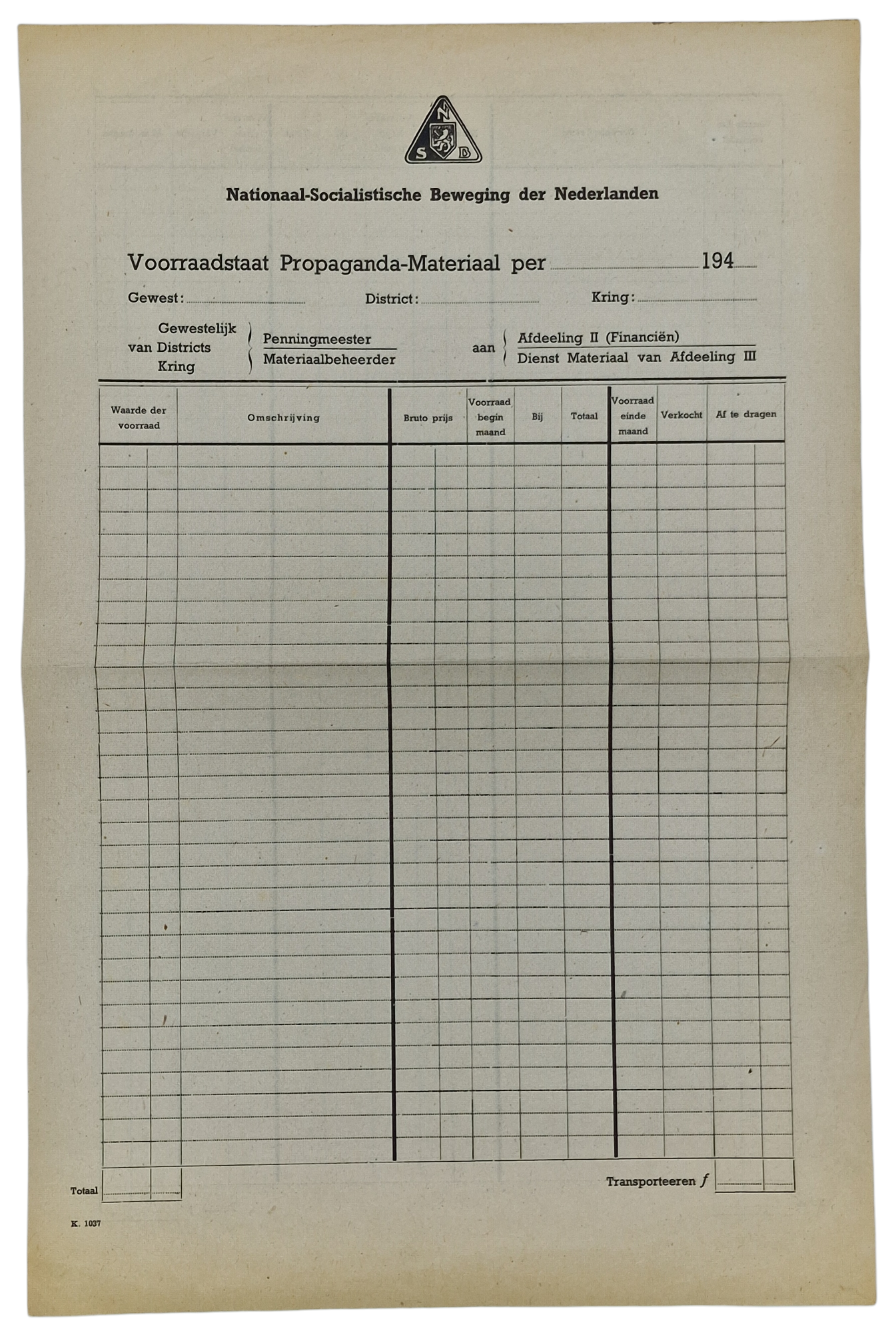 Origineel Wo2 Nederlands Collaboratie NSB Document - Voorraadstaat Propaganda Materiaal