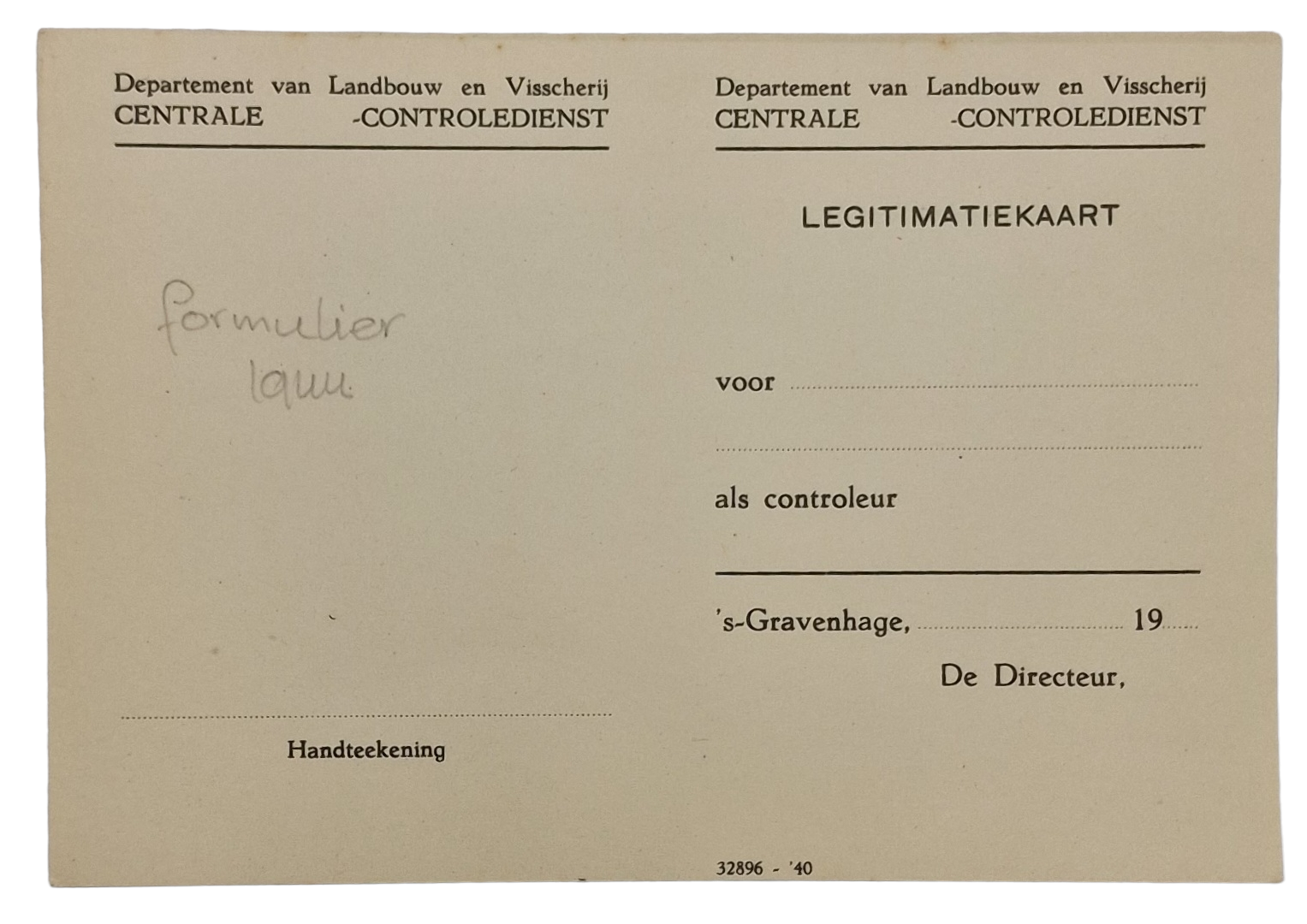 Origineel Wo2 Nederlands Document - Ongebruikt Legitimatiebewijs Landbouw en Visscherij Centrale Controledienst (1940)