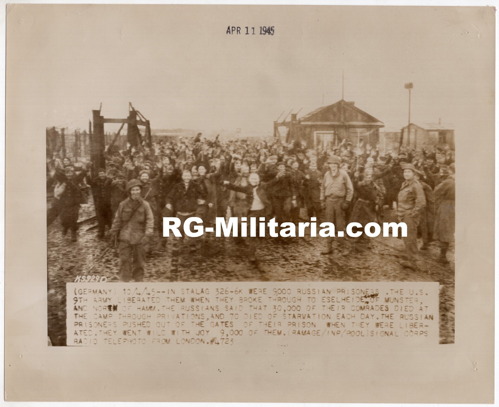 Originele WO2 Amerikaanse US Persfoto - 9th US Army bevrijding van het Russiche Krijgsgevangenekamp Stalag 326-6k, Eselheide, Duitsland (1945)