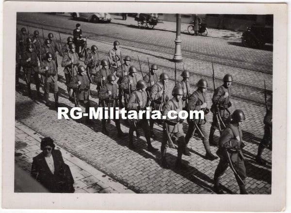 Originele Wo2 Nederlandse Foto - Nederlandse soldaten marcheren, Den Haag, mei (1940)