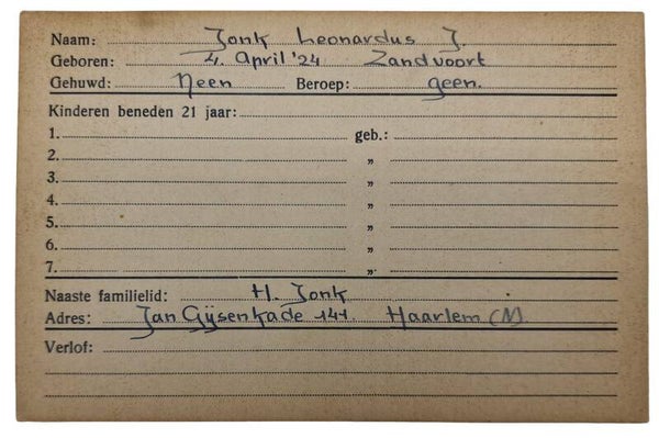 Registration card for a Dutch interpreter in allied service. the Closest relative lives in Haarlem, Jozef Leonardus Jonk.