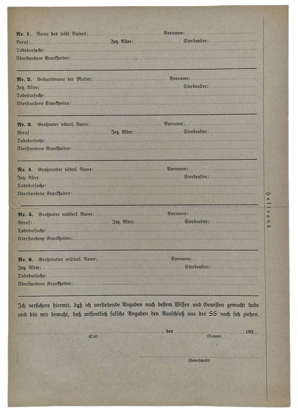 Original WW2 German Waffen SS Document - Waffen SS Marriage questionnaire ''Fragebogen zum Verlobungs und Heiratsgesuch''