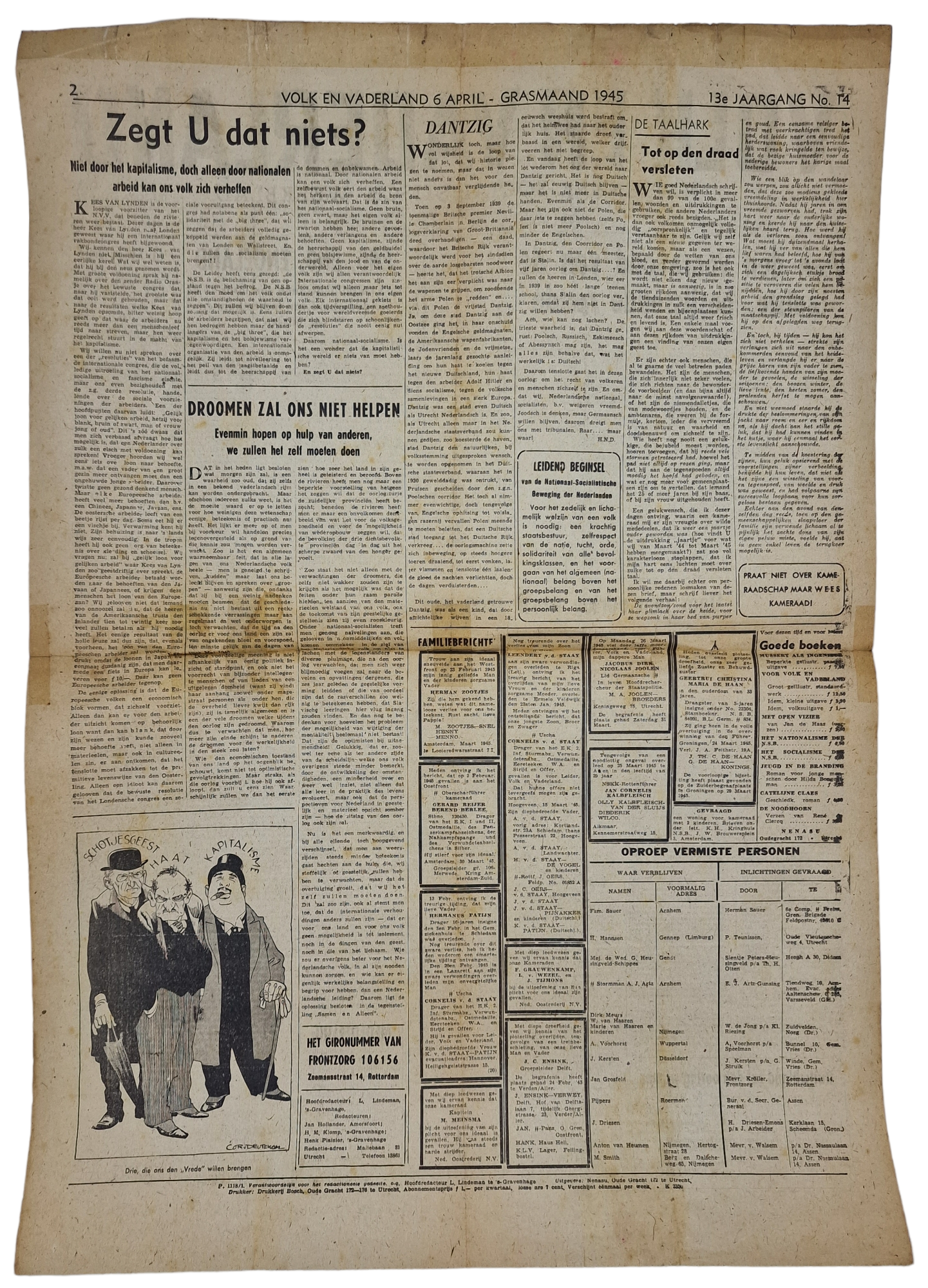 Original WW2 Dutch Collaboration Newspaper - Volk en Vaderland, 13th year No 14 (1945)