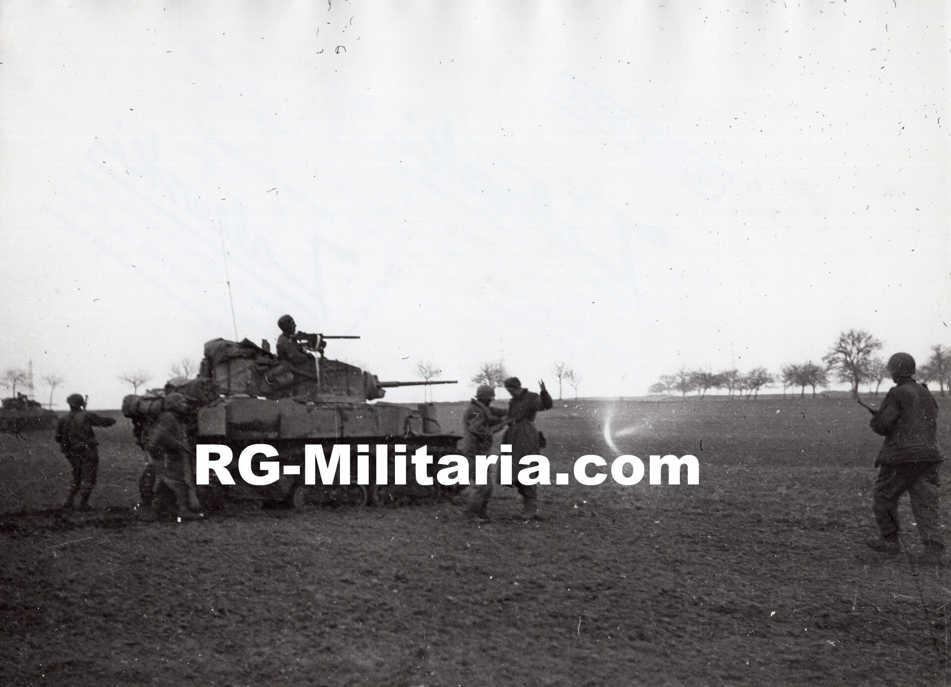 Original WW2 French Press Photo - Captured German POW by a US tank crew (1945)